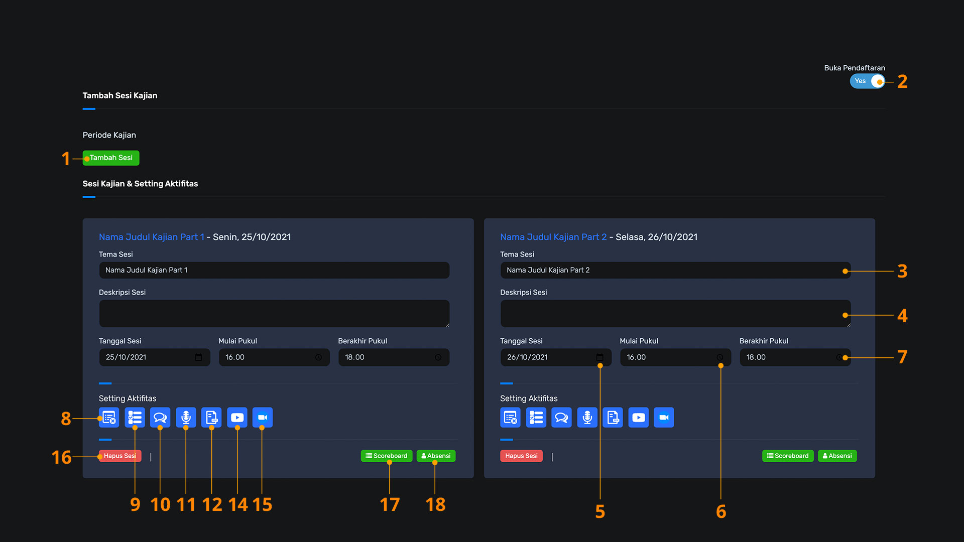 Pada menu Sesi di Setting terdiri dari beberapa fitur (Setting Aktifitas) yang powerful untuk memaksimalkan event / kajian komunitas kamu, antara lain: